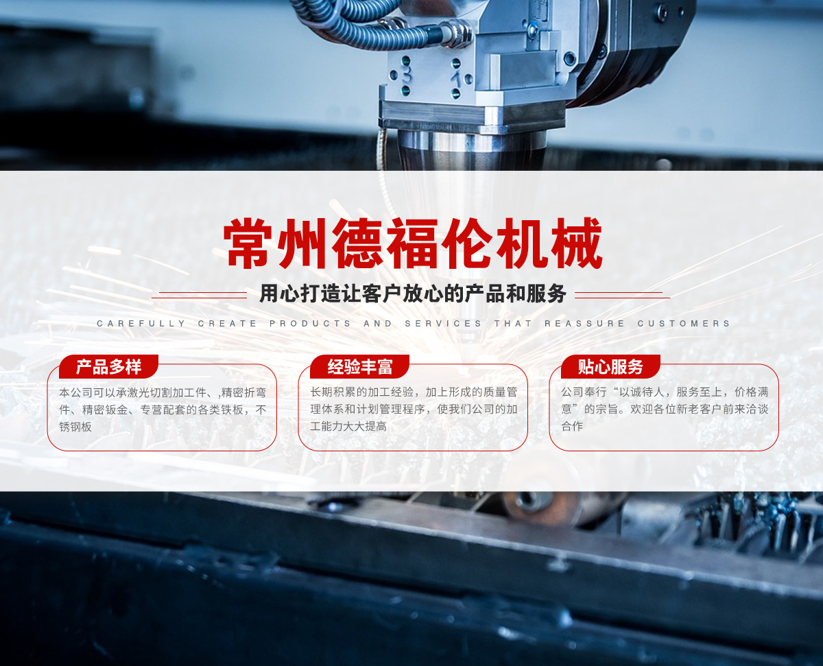 常州德福倫機械有限公司成立于2014年12月19號,位于江蘇省常州市武進區(qū)遙觀鎮(zhèn)建農(nóng)村劍童路56號西門;公司配備;1萬瓦通K激光切割機1臺,6千瓦領(lǐng)C激光切割機1臺;機器行程6米*2.2米,切割不銹鋼50mm,碳鋼30mm;300噸大型數(shù)控折彎機。精密焊接機器數(shù)臺。本公司可以承激光切割加工件、,精密折彎件、精密鈑金、專營配套的各類鐵板,不銹鋼板。長期積累的加工經(jīng)驗,加上形成的質(zhì)量管理體系和計劃管理程序,使我們公司的加工能力大大提高,滿足客戶所需,是我們公司的目標(biāo)!公司奉行“以誠待人,服務(wù)為上,價格滿意”的宗旨。歡迎各位領(lǐng)導(dǎo);老總前來洽談合作!